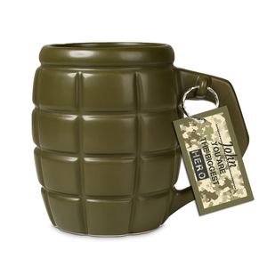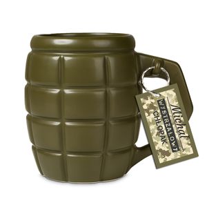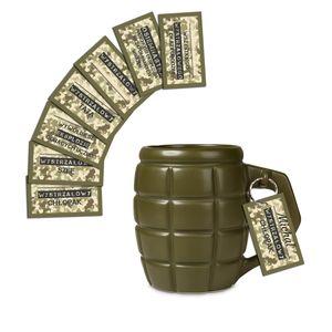 Zielony kubek w kształcie granatu z zawieszkami na różne okazje.